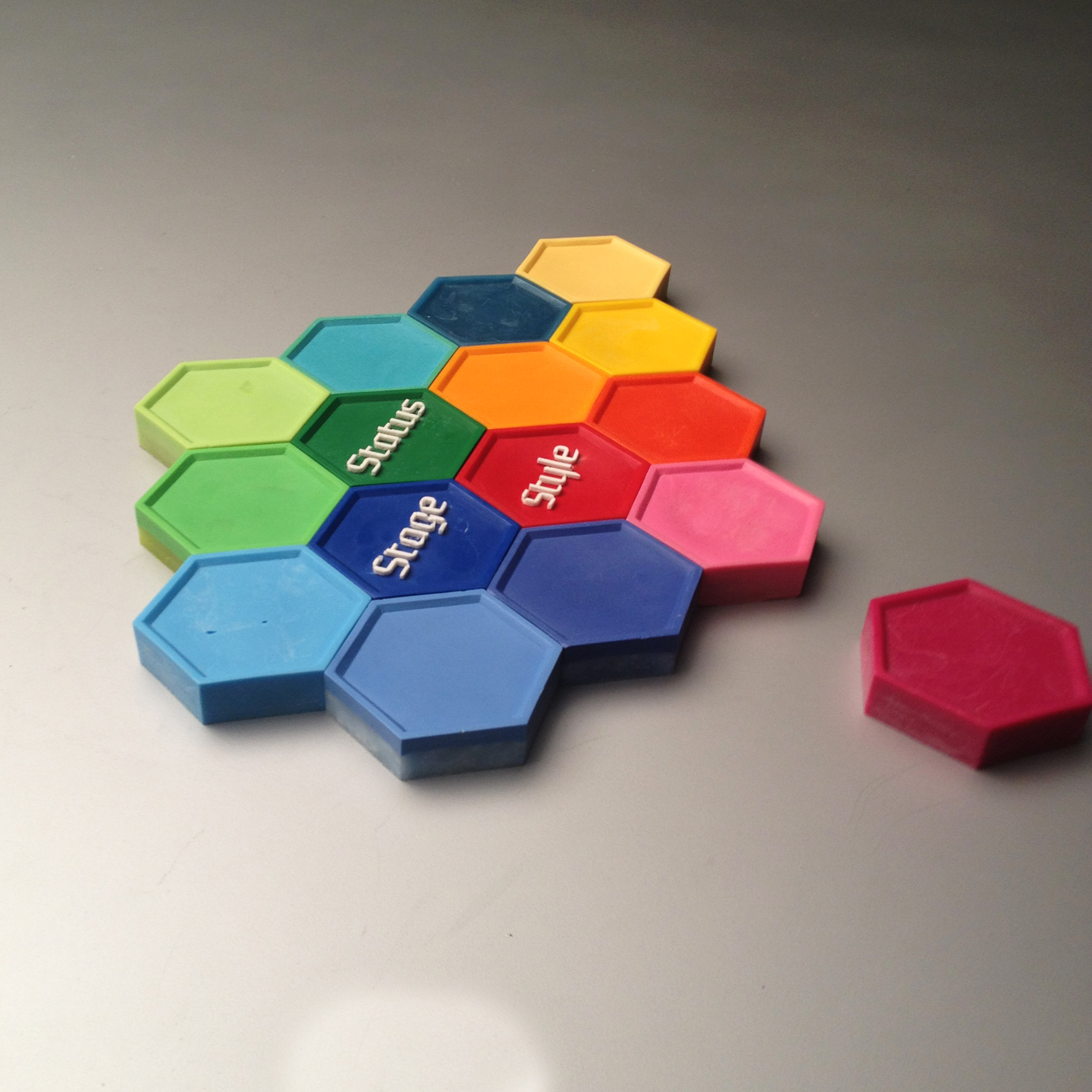 육각형의 도형을 서로 맞춤작업을 하기 위한 정밀한 원형 작업 후 15개의 실리콘 금형을 제작하여, 착색이 아닌 왁스 자체를 조색하는 방법으로 180여개의 솔리드를 구성